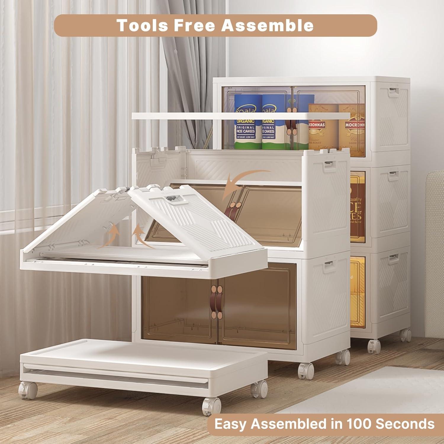 EACH 2.6INCH FOLDABLE & TOOLS-FREE ASSEMBLY: Setting up these stackable storage bins with doors is quick and simple—NO TOOLS NEEDED. You can have them ready to use in just minutes.Easily fold down to JUST 2.6 inches each tiers when not in use. Especially when you want to move house, you don't need to move bulky cabinets and worry about them being damaged due to transportation. It is a good alternative idea to fixed furniture cabinets and small miscellaneous boxes!