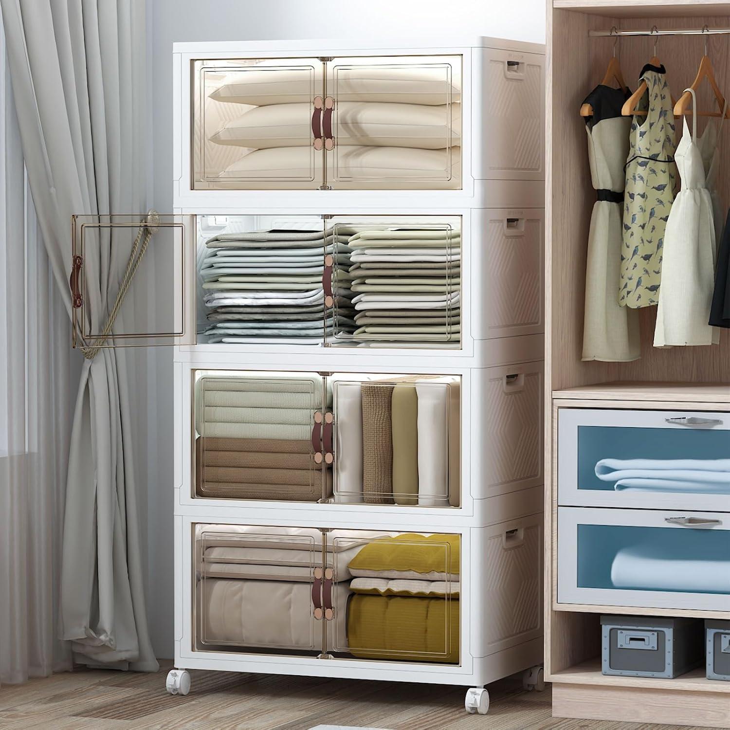 STACKING WITH LOCKING STABILITY: Engineered with interlocking grooves and dual side locks, these stackable plastic storage bins stay firmly in place even when stacked high. SMOOTH ROLLING WHEELS FOR EASY MOVING: These stackable storage bins with wheels come equipped with 4 of 360°smooth-gliding wheels.. Whether you're reorganizing your closet, adjusting your dorm layout, or refreshing your office space, these bins offer flexible and convenient mobility.