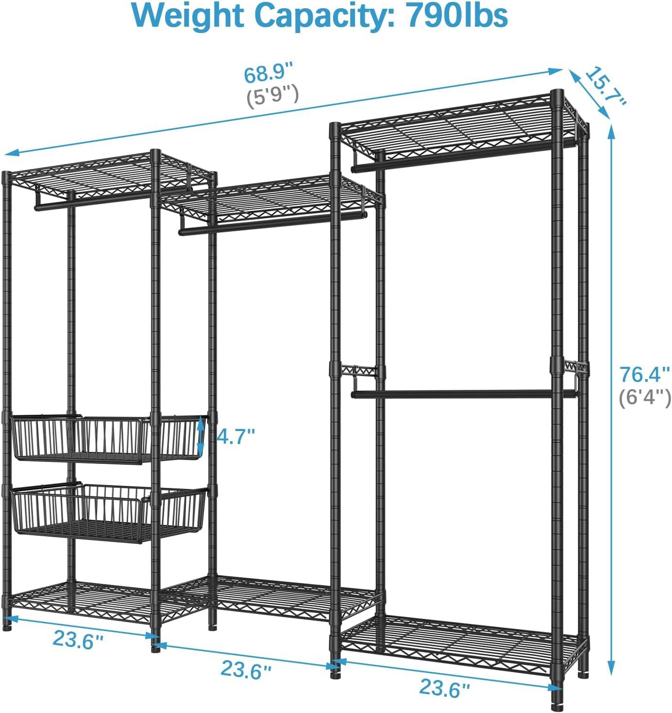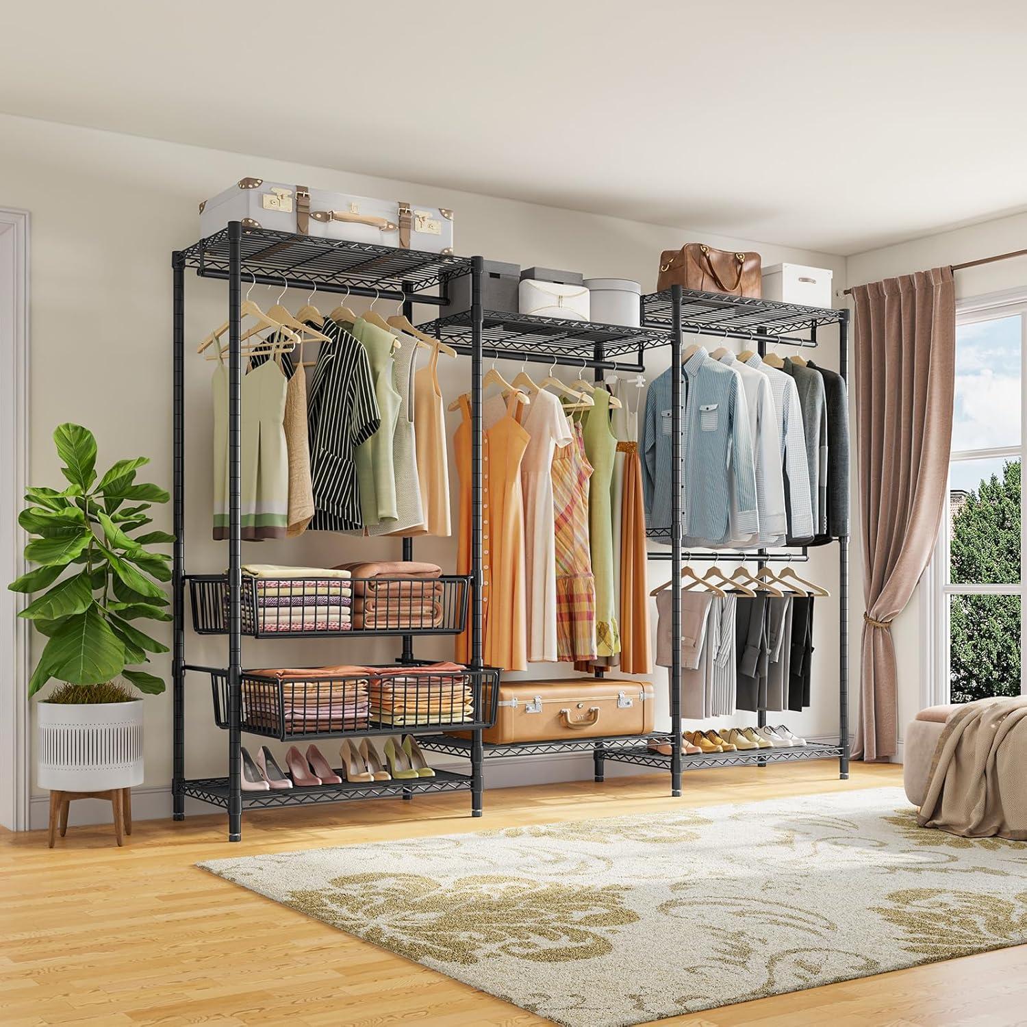 VIPEK V10 Garment Rack Large Size Heavy Duty Clothes Rack with Hanging Rods, Adjustable Shelves & 2 Slid Storage Baskets, Wire Clothing Rack 68.9″ W x 15.7″ D x 76.4″ H, Max Load 920 LBS, Black(Black)